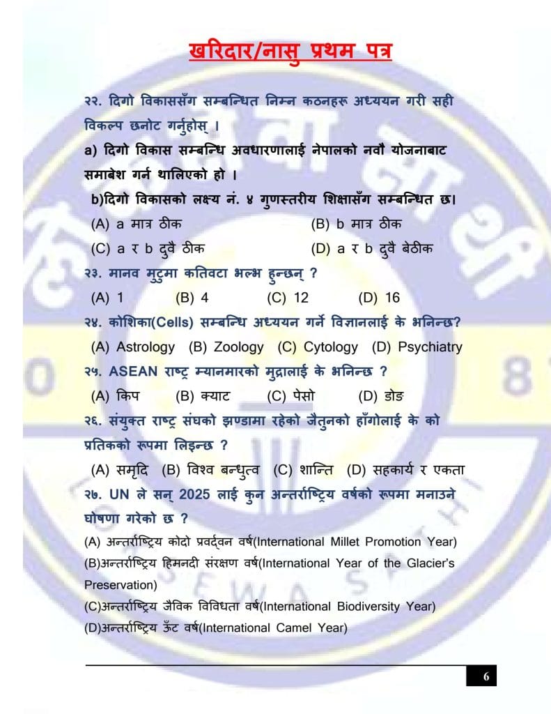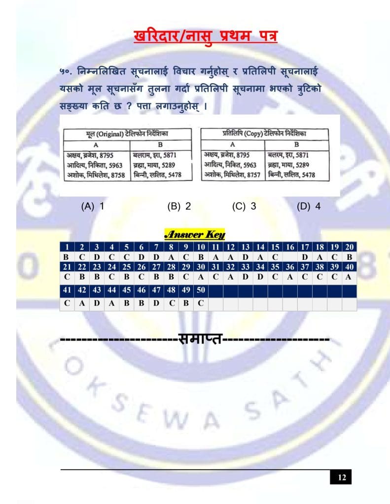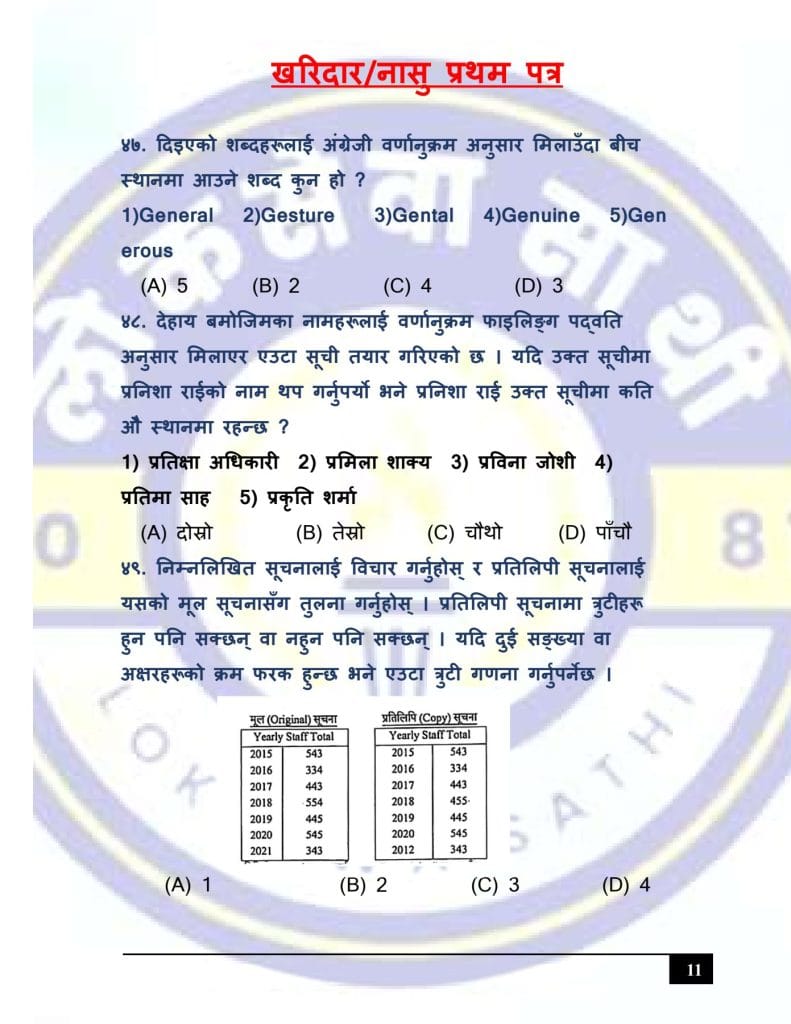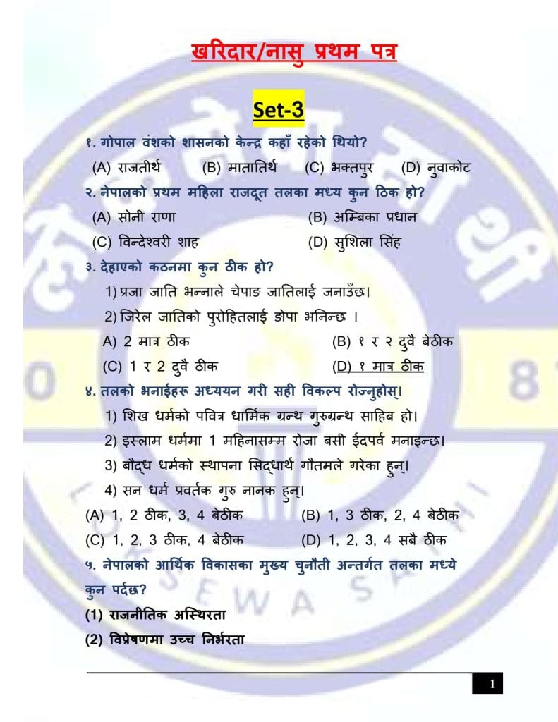At Loksewa Sathi, we are committed to supporting your journey toward success in government service exams. Today, we are excited to present “Kharidar/Nasu First Paper Model Set 3 (GK & IQ)” for the First Paper of Kharidar/Nasu level exams, designed specifically to align with the latest syllabus and question format prescribed by the Public Service Commission(Loksewa Aayog), Nepal.